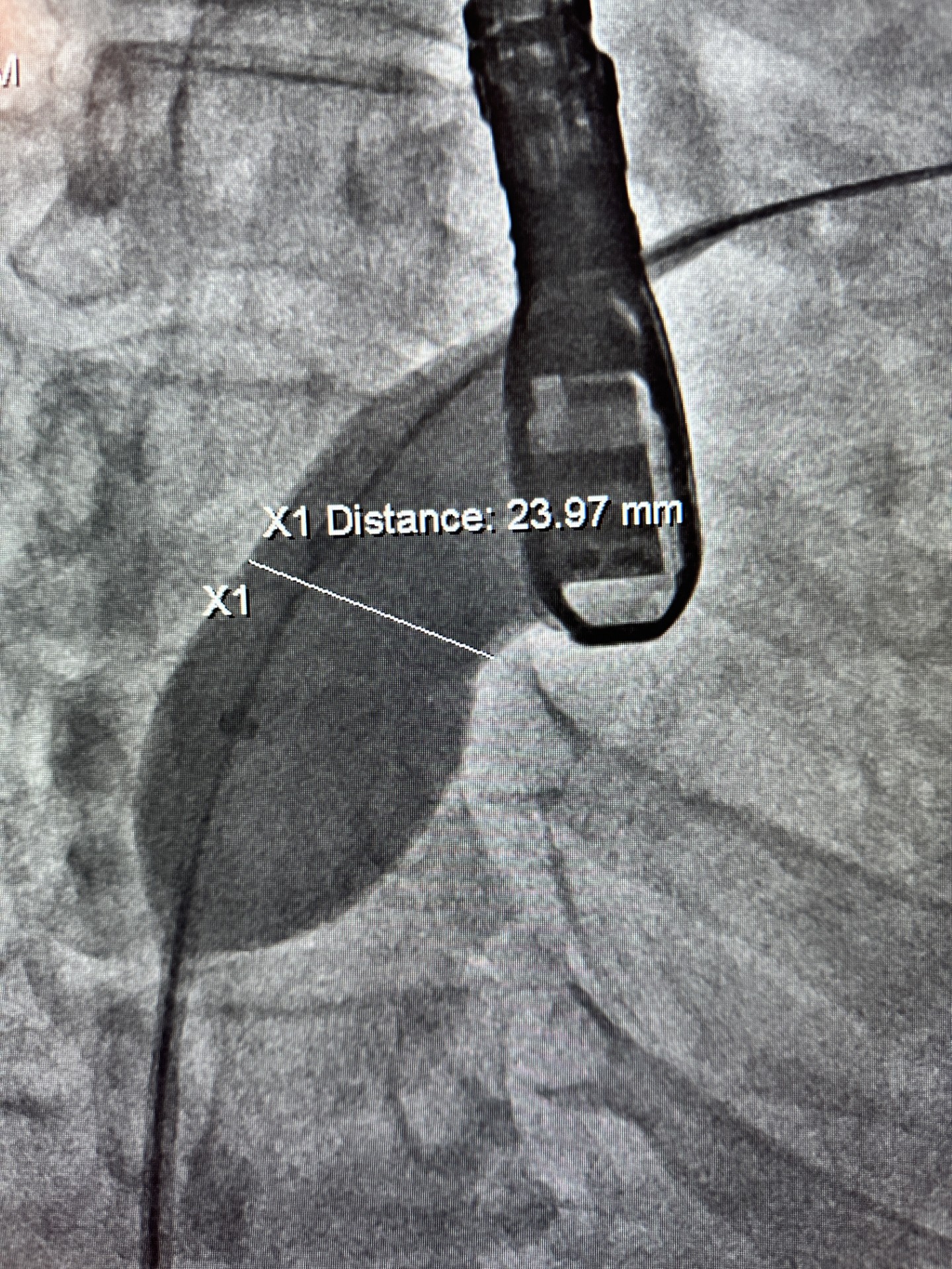 • Calibrate cine image between 2 black dots in the sizing balloon (15cm).